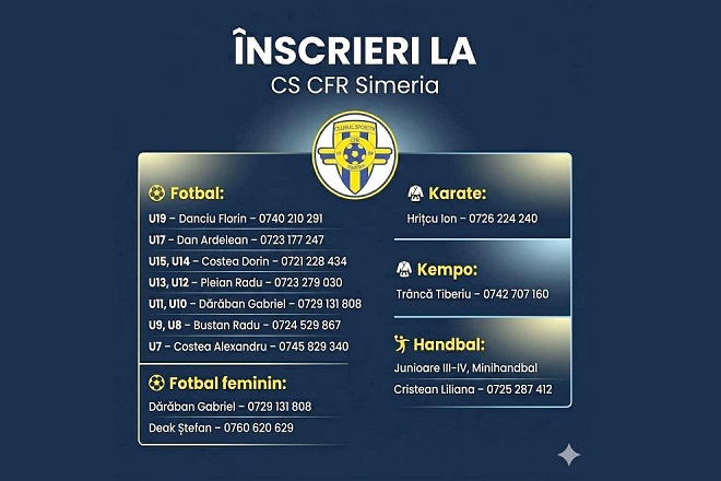 Clubul Sportiv CFR Simeria lansează o invitație deschisă tuturor copiilor și tinerilor din localitate și din împrejurimi care doresc să facă pasul de la simpla joacă la sportul organizat. Sub deviza dezvoltării prin disciplină și pasiune, clubul anunță deschiderea perioadei de înscrieri pentru o gamă diversificată de discipline sportive.
